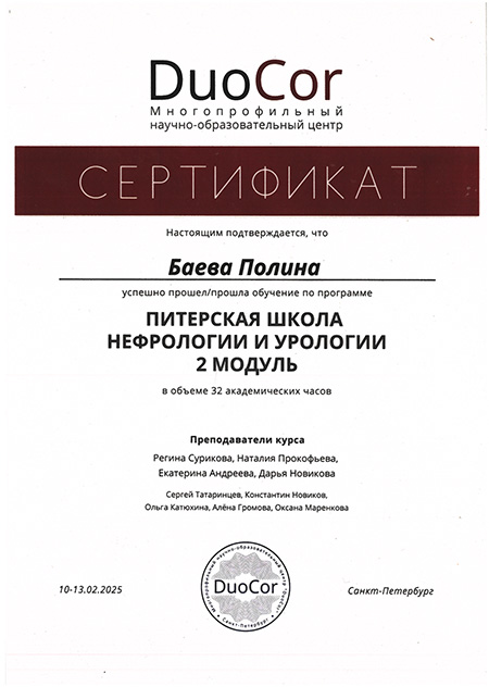 - 2025 г. Сертификат о прохождении обучения по программе «Питерская школа нефрологии и урологии. 2 модуль», DuoCor