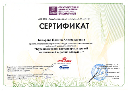 - 2021 г. Сертификат о прохождении лекционного и практического курса «Курс подготовки ветеринарных врачей интенсивной терапии. Модуль 1», АНО ДПО «Первый ветеринарный институт им. В.Н.Митина»