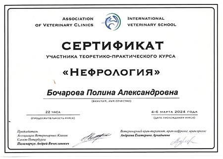 - 2024 г. Сертификат участника теоретико-практического курса «Нефрология», Ассоциация ветеринарных клиник