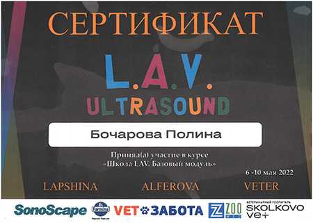 - 2022 г. Сертификат о участника курса «Школа LAV. Базовый модуль», L.A.V. Ultrasound