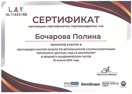- 2024 г. Сертификат участника обучающего мастер-класса по ветеринарной ультрасонографии «Биопсии и центезы под УЗ-контролем», L.A.V. Ultrasound