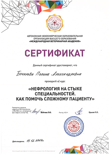 - 2024 г. Сертификат о прохождении курса «Нефрология на стыке специальностей. Как помочь сложному пациенту», АНО ОВО «Международная ветеринарная академия»