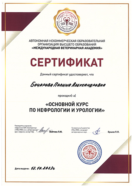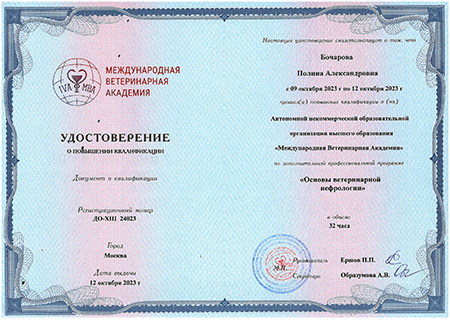 - 2023 г. Удостоверение о повышении квалификации по дополнительной профессиональной программе «Основы ветеринарной нефрологии», АНО ОВО «Международная ветеринарная академия»