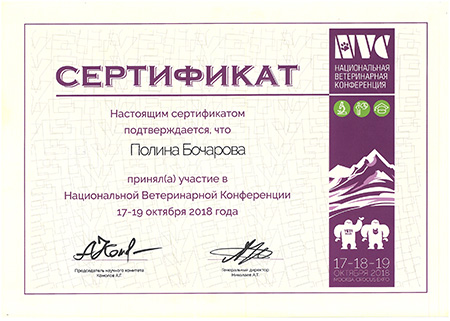 - 2018 г. Сертификат участника в «Национальной ветеринарной конференции NVC2018», NVC