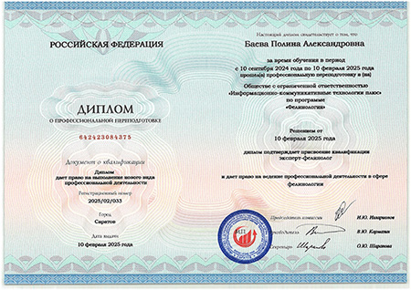 - 2025 г. Диплом о профессиональной переподготовке с присвоением квалификации эксперт-фелинолог с правом ведения профессиональной деятельности в сфере филинологии, ООО «Информационно-коммуникативные технологии плюс»
