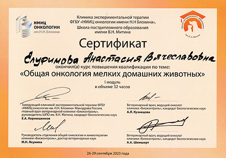 - 2023 г. Сертификат об окончании курса повышения квалификации по теме: «Общая онкология мелких домашних животных», Школа постдипломного образования им. В.Н. Митина