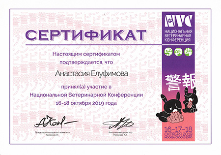 - 2019 г. Сертификат участника Национальной Ветеринарной Конференции, NVC