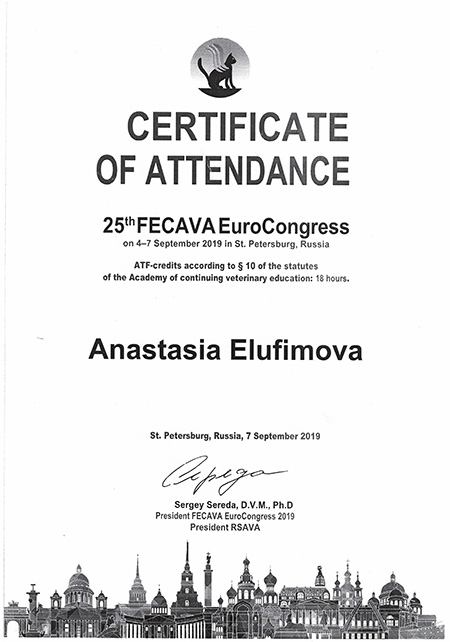 - 2019 г. Сертификат участника 25 европейского конгресса FECAVA, 25th FECAVA EuroCongress