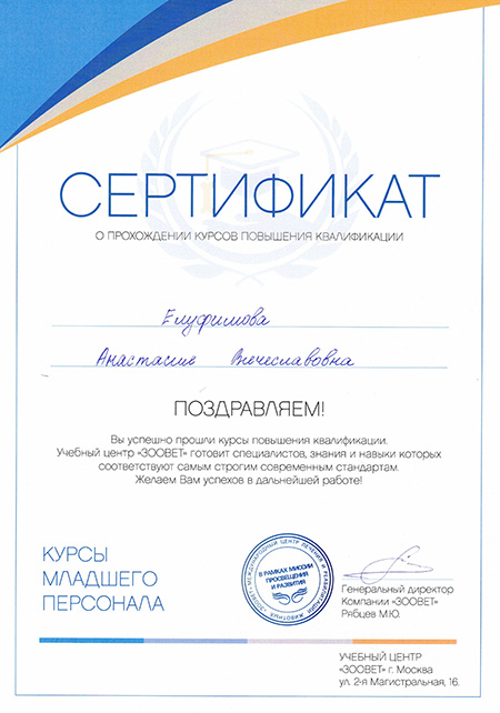 - 2019 г. Сертификат о прохождении курсов повышения квалификации: «Курсы младшего персонала», Зоовет