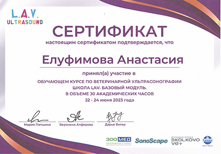 - 2023 г. Сертификат участника «Обучающего курса по ветеринарной ультрасонографии. Школа LAV. Базовый модуль.», L.A.V. Ultrasound
