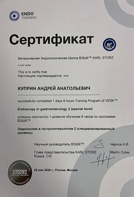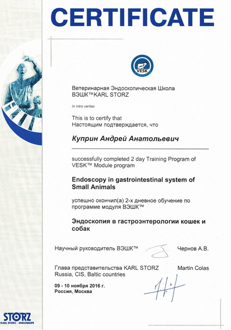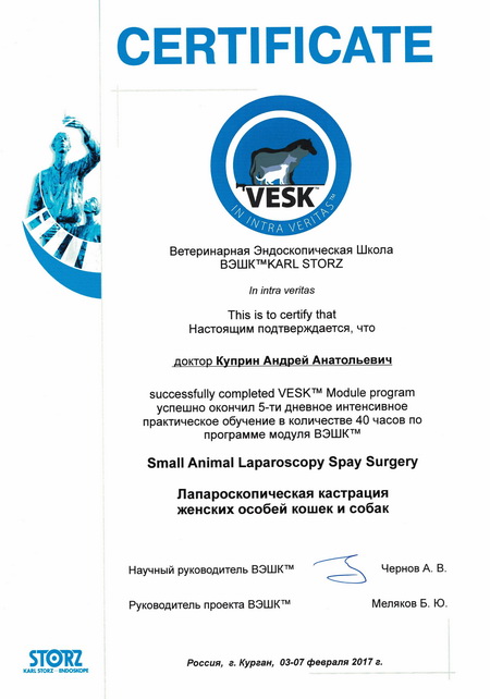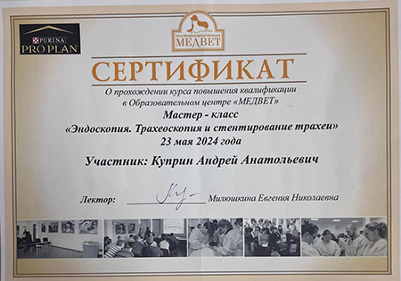- Эндоскопические операции и исследования (цистоскопия, риноскопия, отоскопия, гастроскопия, трахеоскопия, бронхоскопия, бронхо-альвеолярный лаваж, лапароскопические стерилизации и кастрации крипторхов).