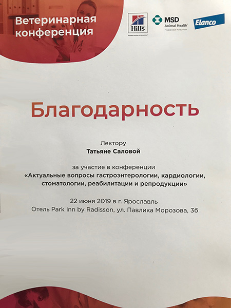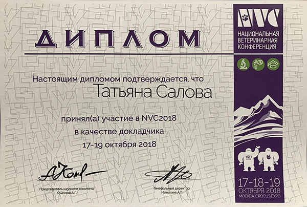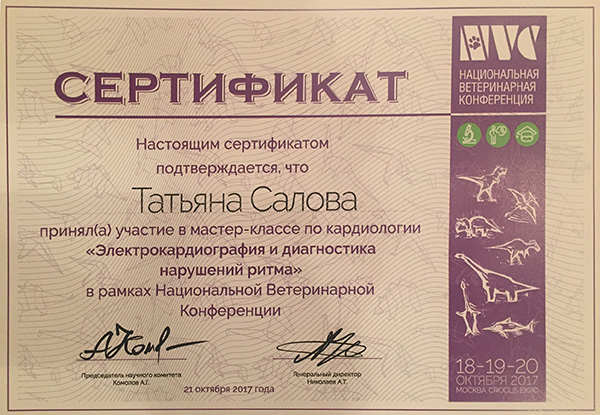 - 2016 г. Сертификат участника мастер-класса по кардиологии «Классификация, диагностика и лечение наджелудочковых нарушений ритма у собак», «NVC»