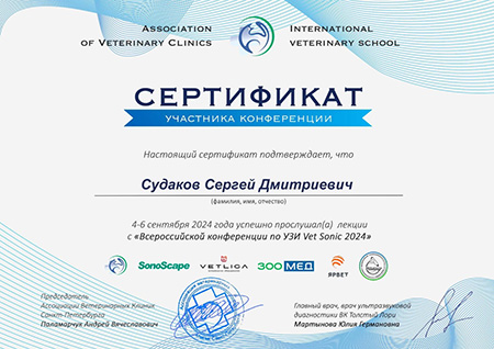 - 2024 г. Сертификат слушателя лекций с «Всероссийской конференции по УЗИ Vet Sonic 2024», Ассоциация ветеринарных клиник Санкт-Петербурга