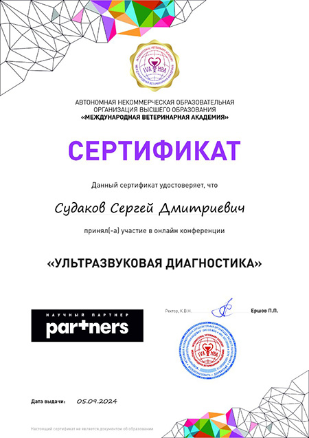 - 2024 г. Сертификат участника онлайн конференции «Ультразвуковая диагностика», Международная ветеринарная академия