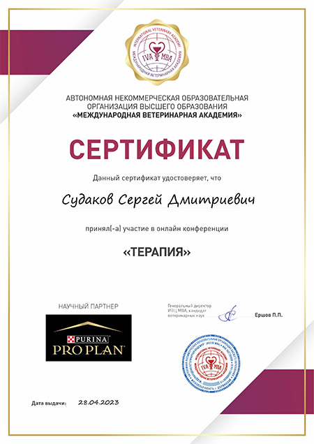 - 2023 г. Сертификат участника онлайн-конференции «Терапия», Международная ветеринарная академия