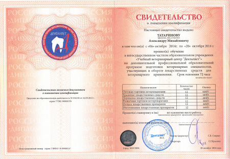 - 2014 г. Свидетельство о повышении квалификации по программе подготовки ветеринарных специалистов, участвующих в обороте лекарственных средств для ветеринарного применения, Денталвет