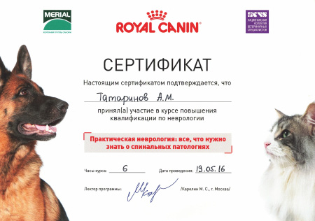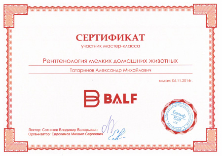 - 2014 г. Сертификат участника мастер-класса «Рентгенология мелких домашних животных», BALF