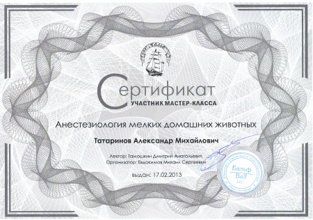 - 2013 г. Сертификат участника мастер-класса «Анестезиология мелких домашних животных», BALF